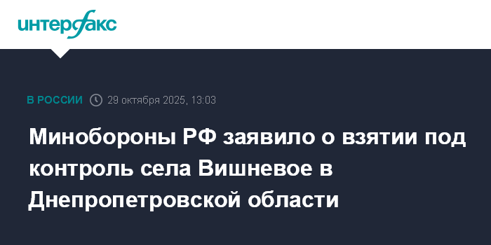 Москва. 29 октября. INTERFAX.RU - Министерство обороны РФ заявило, что под контроль российских войск перешло село Вишневое в Днепропетровской области.
