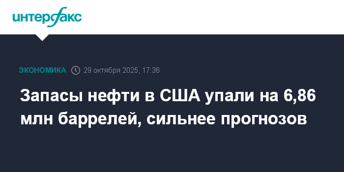 Москва. 29 октября. INTERFAX.RU - Коммерческие запасы нефти в США на прошлой неделе снизились на 6,858 млн баррелей, максимальными темпами за полтора месяца, говорится в еженедельном докладе министерства энергетики.