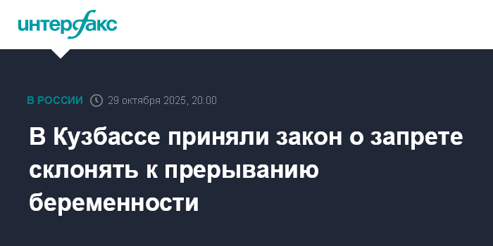 Москва. 29 октября. INTERFAX.RU - Парламент Кузбасса принял закон о запрете склонения к искусственному прерыванию беременности, закон опубликован на сайте Заксобрания региона.