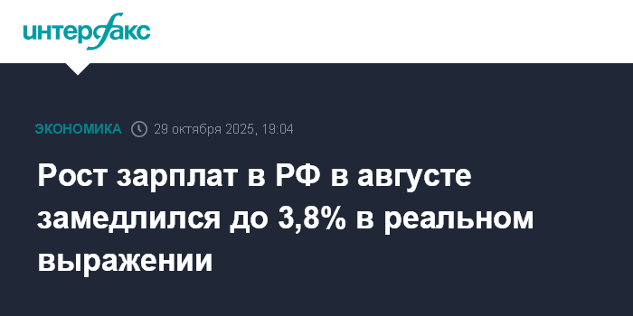 Москва. 29 октября. INTERFAX.RU - Рост реального размера (с поправкой на инфляцию) заработной платы в РФ в августе 2025 года составил 3,8% в годовом выражении после повышения на 6,6% в июле, на 5,1% в июне, на 4,2% в мае, на 4,6% в апреле, на 0,1% в марте, на 3,2% в феврале и на 6,5% в январе, сообщил в среду Росстат.