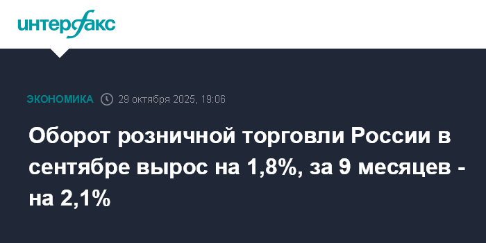 Оборот розничной торговли России в сентябре вырос на 1,8%, за 9 месяцев - на 2,1%