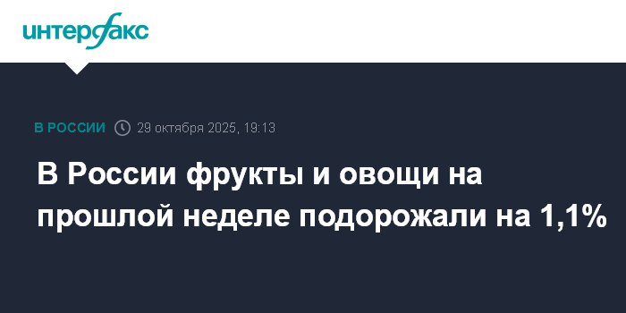 Москва. 29 октября. INTERFAX.RU - В России с 21 по 27 октября плодоовощная продукция подорожала на 1,1%, сообщил Росстат.