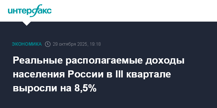 Москва. 29 октября. INTERFAX.RU - В России рост реальных располагаемых доходов населения в III квартале 2025 года составил 8,5% в годовом сравнении, сообщил Росстат.