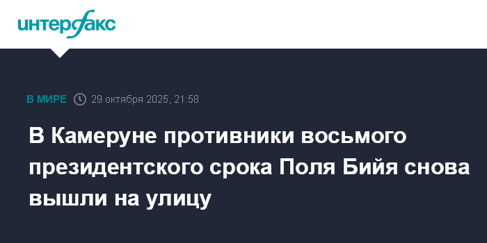 Москва. 29 октября. INTERFAX.RU - В Камеруне противники нового президентского срока Поля Бийя снова вышли на акции протеста в крупнейшем городе и экономическом центре страны Дуале, сообщают западные СМИ.