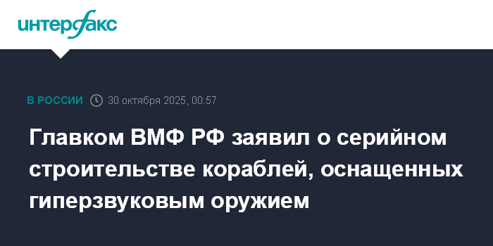 Москва. 30 октября. INTERFAX.RU - Россия серийно развернула строительство кораблей, которые оснащены гиперзвуковым оружием, заявил главнокомандующий Военно-морским флотом РФ Александр Моисеев.