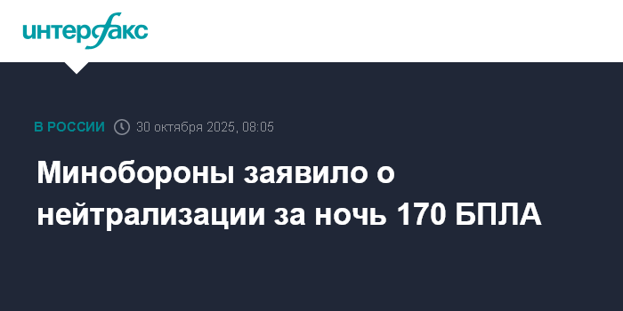 Москва. 30 октября. INTERFAX.RU - Российские военные за ночь перехватили и уничтожили 170 беспилотников самолетного типа, сообщило Минобороны.