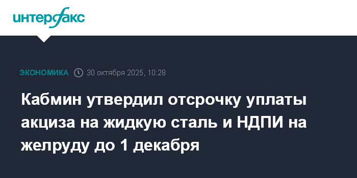 Москва. 30 октября. INTERFAX.RU - Правительство РФ утвердило отсрочку уплаты акциза на жидкую сталь и НДПИ на железную руду до 1 декабря 2025 года.
