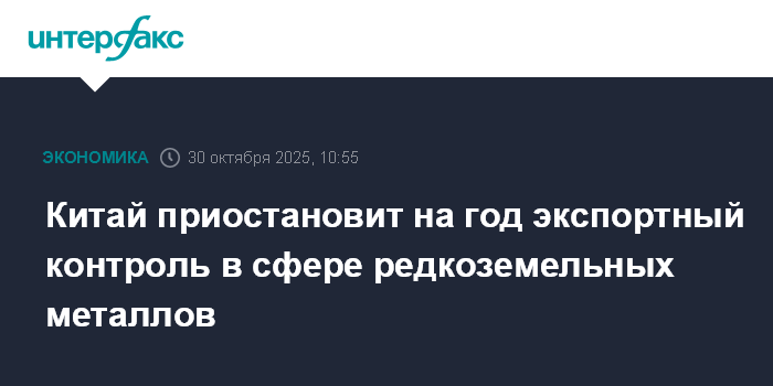 Москва. 30 октября. INTERFAX.RU - Правительство Китая решило приостановить действие введенных ранее в октябре мер экспортного контроля, касающихся редкоземельных металлов, сообщает Bloomberg.