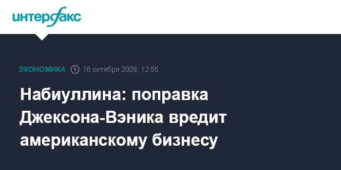 Москва. 16 октября. INTERFAX.RU - Поправка Джексона-Вэника, ограничивающая торговлю между Россией и США, является анахронизмом и может нанести ущерб американским компаниям, заявила министр экономического развития РФ Эльвира Набиуллина. Министр напомнила, что поправка была напрямую связана с возможностью эмиграции евреев из СССР. "Советского Союза давно нет, проблема давно решена, а поправка так и осталась, и она, конечно, никоим образом не должна быть увязана с торговыми отношениями", - отметила Набиуллина.