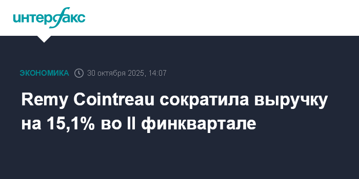Москва. 30 октября. INTERFAX.RU - Французский производитель алкогольной продукции Remy Cointreau SA сократил выручку во втором квартале текущего финансового года на 15,1%, при этом органическое снижение выручки оказалось более существенным, чем ожидали аналитики.