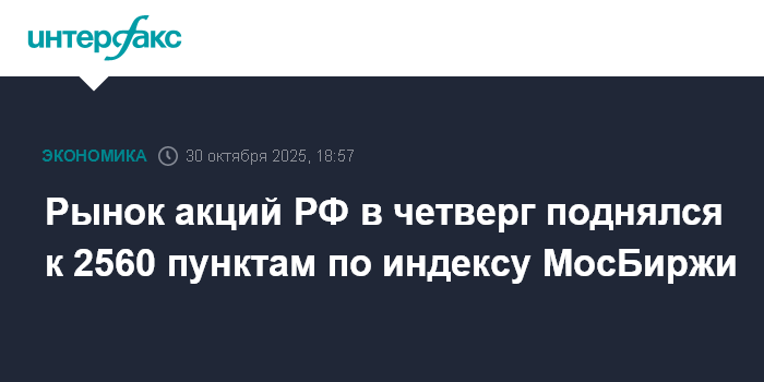 Москва. 30 октября. INTERFAX.RU - Рынок акций РФ в четверг продолжил коррекционное восстановление, подогретое данными Росстата о замедлении недельной инфляции в стране, инвесторы также оценивали поступающие геополитические новости и корпоративные финотчеты. Индекс МосБиржи вырос третьи торги подряд и на фоне ослабления рубля поднялся к 2560 пунктам, отыграв все потери с начала недели.