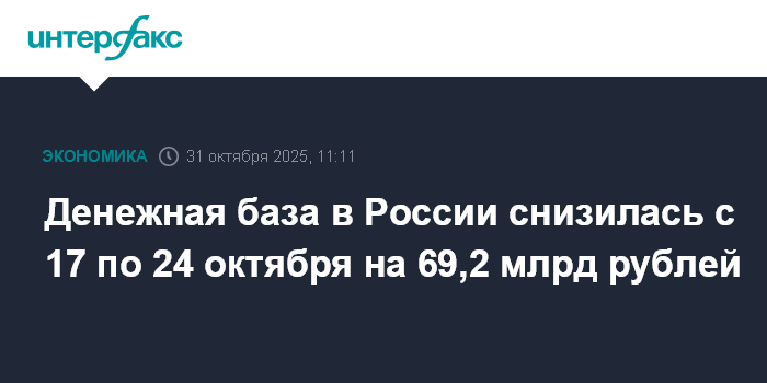 На 17 октября денежная база в России равнялась 19 083,9 млрд рублей. Таким образом, за период она снизилась на 0,37%, или на 69,2 млрд рублей.