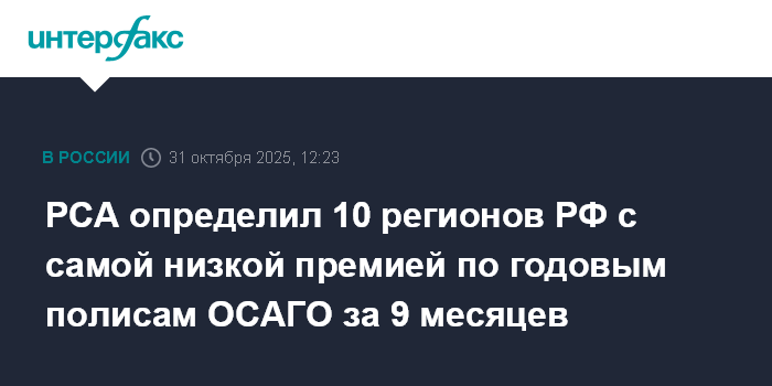 Москва. 31 октября. INTERFAX.RU - Российский союз автостраховщиков (РСА) определил 10 российских регионов с самым низким уровнем средней страховой премии по годовым полисам ОСАГО за 9 месяцев 2025 года, сообщает союз.