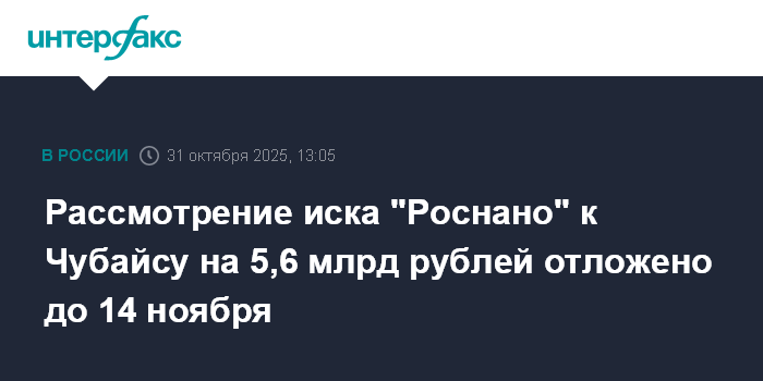 Рассмотрение иска "Роснано" к Чубайсу на 5,6 млрд рублей отложено до 14 ноября