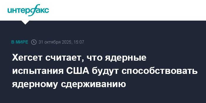 Москва. 31 октября. INTERFAX.RU - Глава Пентагона Пит Хегсет считает решение президента США Дональда Трампа начать испытания ядерного оружия ответственным шагом, который будет содействовать ядерному сдерживанию. Как пишет Le Figaro, министр заявил это в Куала-Лумпуре.