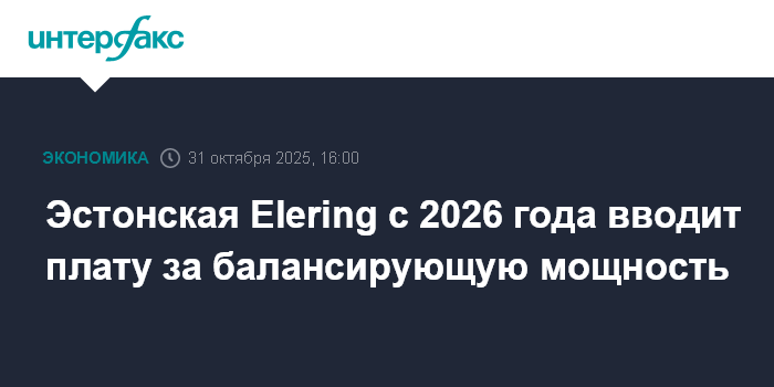 Москва. 31 октября. INTERFAX.RU - Эстонский электросетевой оператор Elering с 2026 года вводит для клиентов новый вид расходов - плату за балансирующую мощность, которую компания назвала "ценой энергонезависимости" после выхода Эстонии из энергокольца БРЭЛЛ.