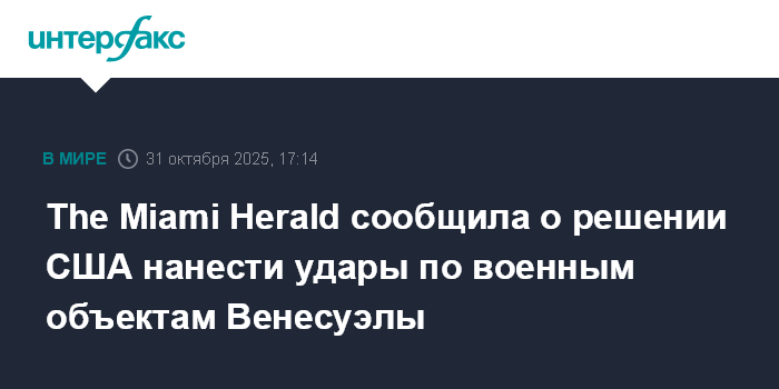 "Собеседники The Miami Herald сообщили, что администрация Трампа приняла решение об ударах по военным объектам на территории Венесуэлы; атаки могут последовать в любой момент", - передает газета.