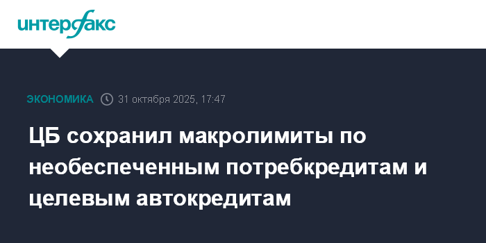 Москва. 31 октября. INTERFAX.RU - Банк России сообщил, что сохранил значения макропруденциальных лимитов (МПЛ) по необеспеченным потребительским кредитам на I квартал 2026 года.