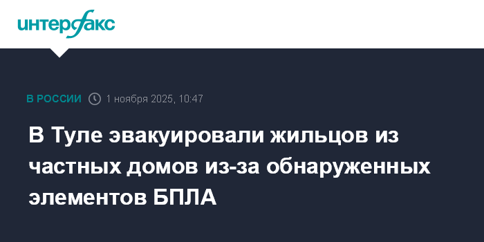 Москва. 1 ноября. INTERFAX.RU - В Туле рядом с местом на улице Кутузова, где упали элементы сбитых БПЛА, из примерно 50 частных домов эвакуировали жильцов из соображений безопасности, сообщил глава городской администрации Илья Беспалов.