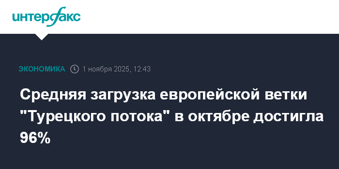 Москва. 1 ноября. INTERFAX.RU - Среднесуточная загрузка европейской ветки газопровода "Турецкий поток", по которой российский газ через территорию Турции поступает на юг Европы, в октябре 2025 года составила 96% после 91% в сентябре, свидетельствуют данные европейских газотранспортных операторов.