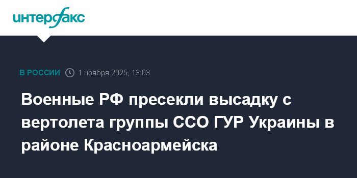 Москва. 1 ноября. INTERFAX.RU - Российские военнослужащие пресекли высадку с вертолёта сил специальных операций ГУР в районе Красноармейска, ликвидированы 11 человек, заявили в Минобороны России в субботу.