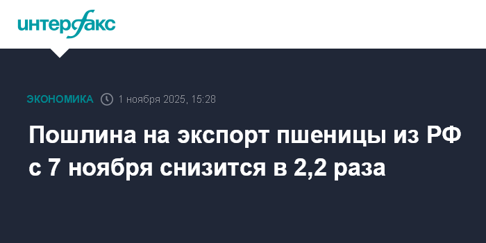 Пошлина на экспорт пшеницы из РФ с 7 ноября снизится в 2,2 раза