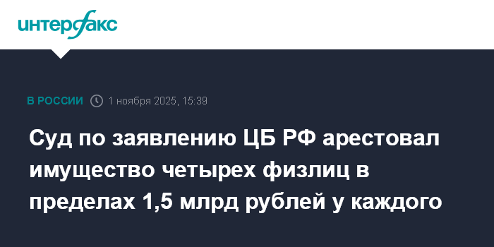 Москва. 1 ноября. INTERFAX.RU - Арбитражный суд Москвы в конце октября по заявлению Банка России арестовал имущество, в том числе денежные средства, четырех человек.