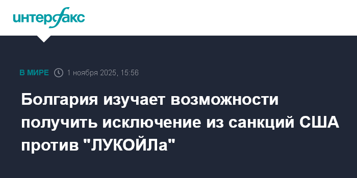 Москва. 1 ноября. INTERFAX.RU - Власти Болгарии хотят добиться исключения из санкций США, которые американские власти ввели против компании "ЛУКОЙЛ", сообщает Politico со ссылкой на источники.