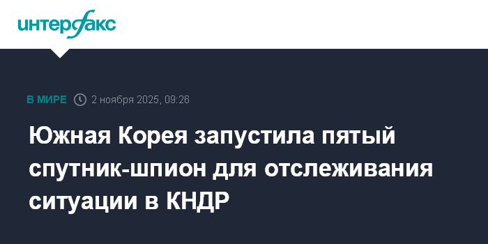 Москва. 2 ноября. INTERFAX.RU - Южная Корея успешно запустила пятый по счету спутник-шпион собственного производства для контроля ситуации в Северной Корее, сообщает в воскресенье "Ренхап".