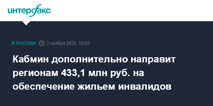 Москва. 2 ноября. INTERFAX.RU - Правительство РФ в 2025 году направит 15 регионам 433,1 млн рублей на обеспечение жильем отдельных категорий граждан - инвалидов и семей с детьми-инвалидами.