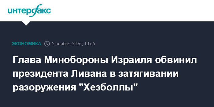 Москва. 2 ноября. INTERFAX.RU - Министр обороны Израиля Исраэль Кац обвинил руководство Ливана в затягивании процесса разоружения "Хезболлы", сообщает Times of Israel.