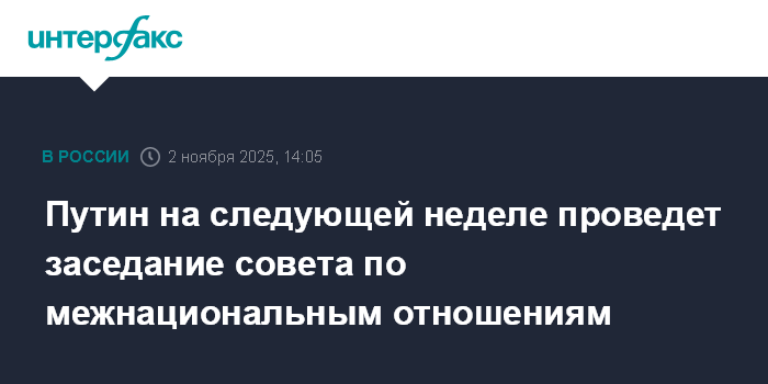 Москва. 2 ноября. INTERFAX.RU - Президент РФ Владимир Путин на следующей неделе посетит один из российских регионов, в его планах также проведение заседания совета по межнациональным отношениям.