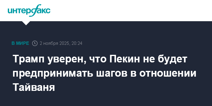 Москва. 2 ноября. INTERFAX.RU - Президент США Дональд Трамп заявил, что в Пекине не намерены предпринимать никаких действий в отношении Тайваня, так как понимают, что в ином случае он не оставит это без ответа.