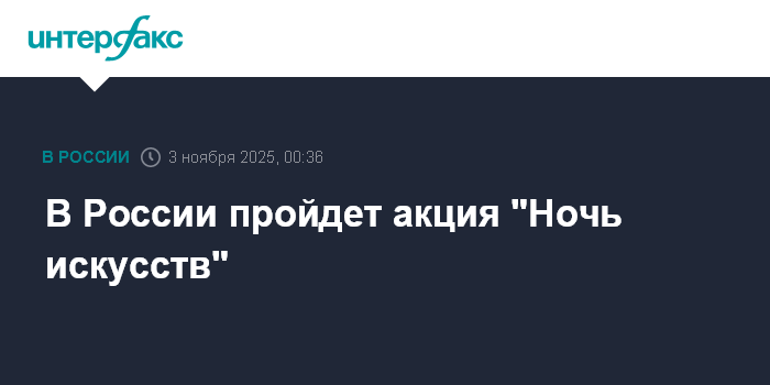 Москва. 3 ноября. INTERFAX.RU - Ежегодная акция "Ночь искусств" пройдет в России 3-4 ноября, в этом году ее мероприятия будут приурочены ко Дню народного единства, всего запланировано более 3,3 тыс. мероприятий, среди которых выставки, концерты, кинопоказы, спектакли и творческие встречи.