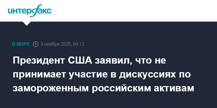 Москва. 3 ноября. INTERFAX.RU - Президент США Дональд Трамп заявил, что не участвует в обсуждении вопросов, связанных с замороженными российскими активами.