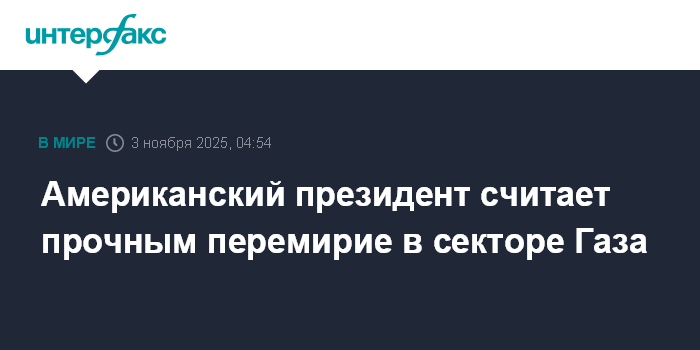 Москва. 3 ноября. INTERFAX.RU - Президент США Дональд Трамп заявил, что соглашение о прекращении огня, достигнутое при его поддержке между палестинским движением ХАМАС и Израилем, весьма прочное.