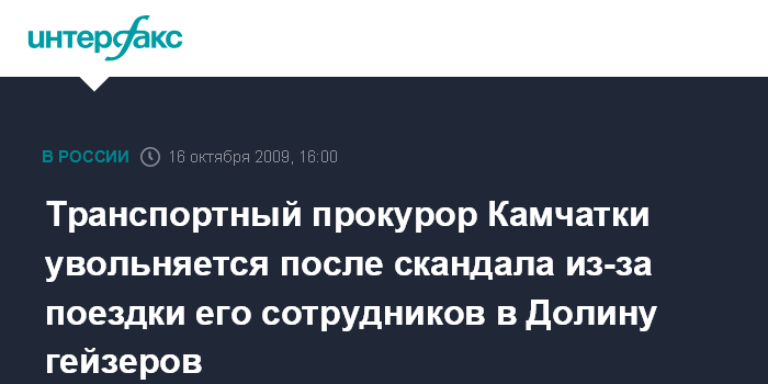 Москва. 16 октября. INTERFAX.RU - Ряд ответственных работников Камчатской транспортной прокуратуры, оказавшихся в центре скандала в связи с сообщениями о пикнике с их участием в заповедной зоне Долины гейзеров, получили серьезные дисциплинарные взыскания, а руководителю прокуратуры грозит увольнение.