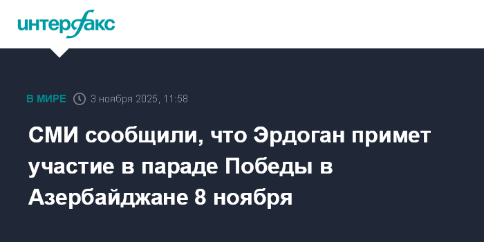 По данным азербайджанского агентства AПA, Эрдоган примет участие в параде Победы, который пройдет в Баку 8 ноября и приурочен к пятой годовщине завершения второй Карабахской войны.