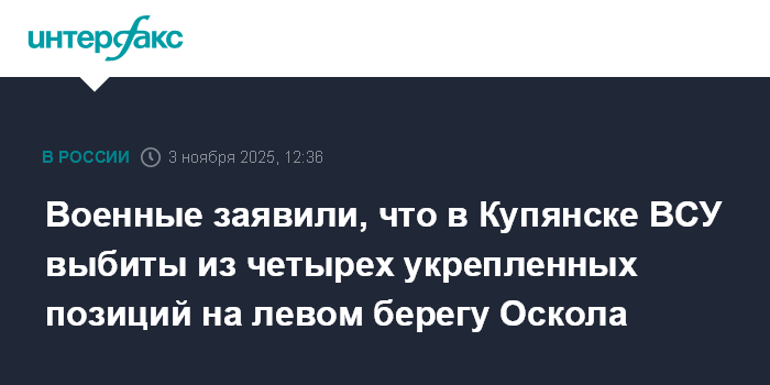 Москва. 3 ноября. INTERFAX.RU - Российские военные в ходе городских боев в Купянске Харьковской области выбили украинские силы из четырех укрепленных позиций в промзоне на левом берегу реки Оскол, сообщило Минобороны РФ в понедельник.