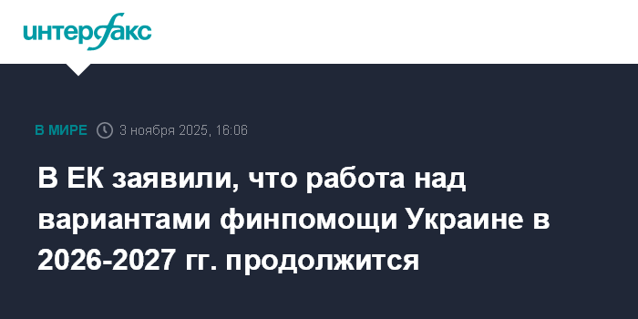 Москва. 3 ноября. INTERFAX.RU - ЕС подтвердил свои обязательства обеспечить финансовую помощь Украине в 2026-2027 годах, идет обсуждение того, как это будет сделано, "репарационный кредит" не снят с повестки, заявила официальный представитель Еврокомиссии (ЕК) Паула Пинью.