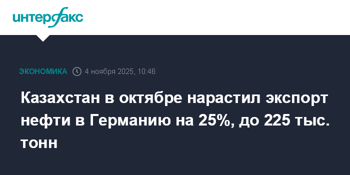 Москва. 4 ноября. INTERFAX.RU - Объем транспортировки казахстанской нефти в Германию по системе нефтепровода "Дружба" в октябре текущего года составил 225 тыс. тонн, что на 25% выше уровня сентября 2025 года, сообщили "Интерфаксу" в нацкомпании "КазТрансОйл" (КТО).