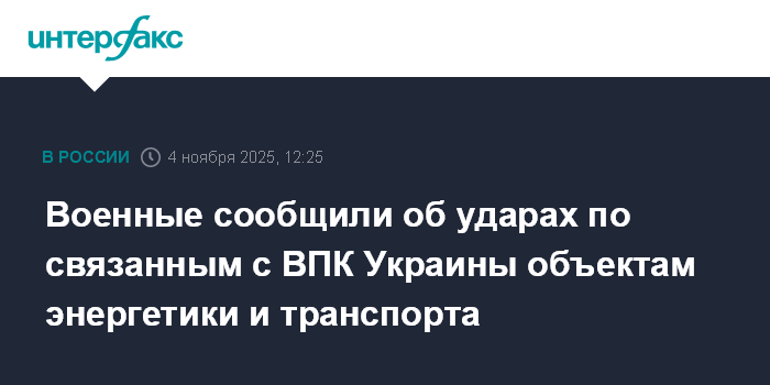 Москва. 4 ноября. INTERFAX.RU - Российские военные в течение суток нанесли удары по связанным с украинским военно-промышленным комплексом объектам энергетической и транспортной инфраструктуры, заявило Минобороны РФ во вторник.