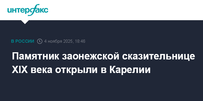 Москва. 4 ноября. INTERFAX.RU - Церемония открытия памятника заонежской сказительнице XIX века Ирине Андреевне Федосовой прошла в Петрозаводске, сообщил глава Карелии Артур Парфенчиков во вторник в соцсети "ВКонтакте".