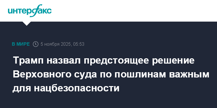 Москва. 5 ноября. INTERFAX.RU - Президент США Дональд Трамп назвал предстоящее решение Верховного суда США по вопросу о законности введенных им пошлин судьбоносным и имеющим отношение к национальной безопасности страны.