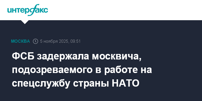 Москва. 5 ноября. INTERFAX.RU - ФСБ сообщила о задержании и аресте жителя Москвы, подозреваемого в передаче сведений о гражданах спецслужбе одной из стран НАТО.