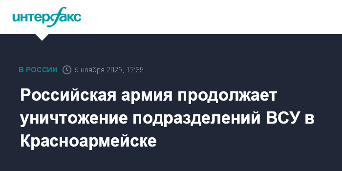 Москва. 5 ноября. INTERFAX.RU - Войска группировки "Центр" уничтожают окруженные подразделения ВСУ в Красноармейске, наступают в северном направлении, сообщило министерство обороны РФ в среду.
