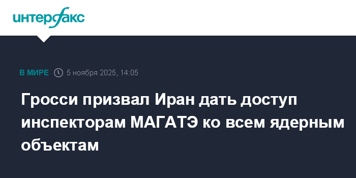 Москва. 5 ноября. INTERFAX.RU - Тегеран должен расширить сотрудничество с МАГАТЭ и пустить инспекторов агентства на все свои ядерные объекты, заявил Financial Times глава МАГАТЭ Рафаэль Гросси.