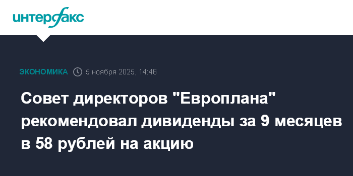 Москва. 5 ноября. INTERFAX.RU - Совет директоров лизинговой компании "Европлан" рекомендовал акционерам выплатить дивиденды за девять месяцев 2025 года в размере 58 рублей на одну акцию, сообщила компания.