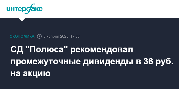 Москва. 5 ноября. INTERFAX.RU - Совет директоров ПАО "Полюс" рекомендует выплатить промежуточные дивиденды в размере 36 рублей на акцию, сообщила компания.
