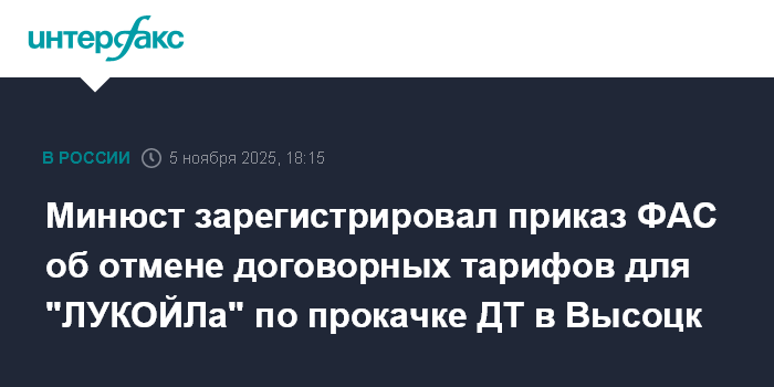 Минюст зарегистрировал приказ ФАС об отмене договорных тарифов для "ЛУКОЙЛа" по прокачке ДТ в Высоцк